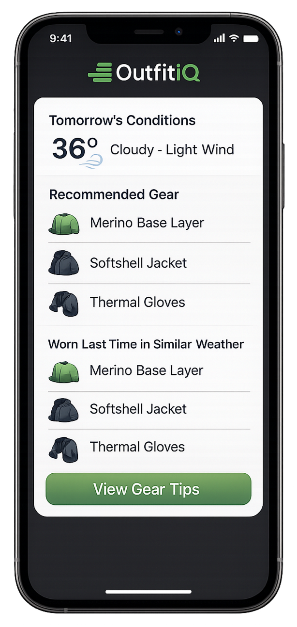 OutfitIQ helps outdoor athletes track what they wore, how it felt, and what the weather was — so next time, you know exactly what to wear.